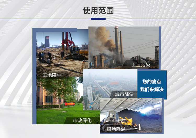 除塵范圍:粉塵治理、露天物料堆場、煤炭物流園區(qū)、露天礦山開采、露天爆破粉塵、封閉卸料區(qū)、卡車卸料口、自卸車卸料粉塵、大型裝載車工作粉塵、沿海港口裝運、轉(zhuǎn)運煤炭、礦石、散裝粉料搬運等粉塵污染治理;保濕降溫:飛機(jī)場、高速公路、車站、碼頭、公共場所、運動場地、炎熱場地等大范圍降塵保濕降溫消毒;噴藥病害防治:垃圾填埋場、衛(wèi)生防疫、城市園林綠化以及自然災(zāi)害過后大面積的殺菌、消毒、除臭、防疫防治病蟲害等。