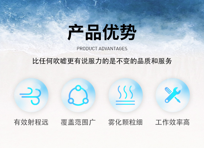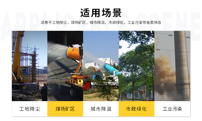 除塵范圍:粉塵治理、露天物料堆場、煤炭物流園區(qū)、露天礦山開采、露天爆破粉塵、封閉卸料區(qū)、卡車卸料口、自卸車卸料粉塵、大型裝載車工作粉塵、沿海港口裝運、轉(zhuǎn)運煤炭、礦石、散裝粉料搬運等粉塵污染治理;保濕降溫:飛機場、高速公路、車站、碼頭、公共場所、運動場地、炎熱場地等大范圍降塵保濕降溫消毒;噴藥病害防治:垃圾填埋場、衛(wèi)生防疫、城市園林綠化以及自然災(zāi)害過后大面積的殺菌、消毒、除臭、防疫防治病蟲害等。